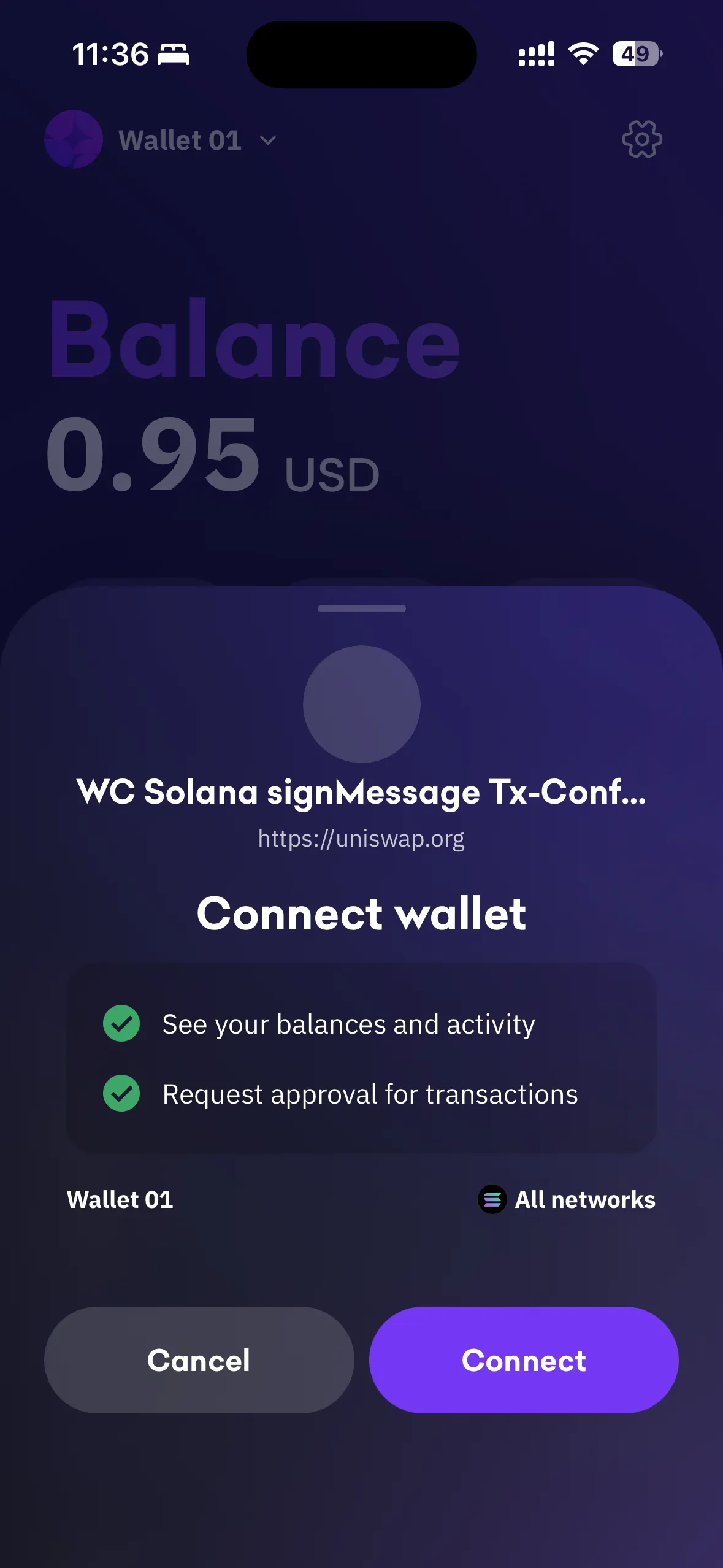 const url = proposal?.verifyContext?.verified?.origin ?? proposal.params.proposer.metadata.url;// ...const analyseUrlResult = await analyseUrl(url, allAccounts);So, any new dApp created via WalletConnect or another dApp maker can change their metadata to a verified dApp provider from Kraken. For the PoC, we chose Uniswap https://app.uniswap.org.